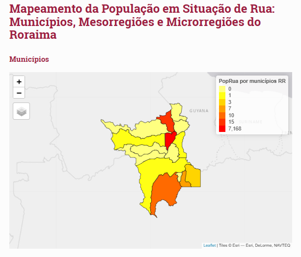 Segundo o levantamento, 99,47% das pessoas em situação de rua em Roraima estão em Boa Vista, que concentra 7.168 registros. Dos 15 municípios do estado, apenas oito apresentaram ocorrência dessa população. Pacaraima aparece com 15 pessoas cadastradas, seguida por Rorainópolis, com 10, enquanto os demais municípios têm números residuais ou não registraram casos.