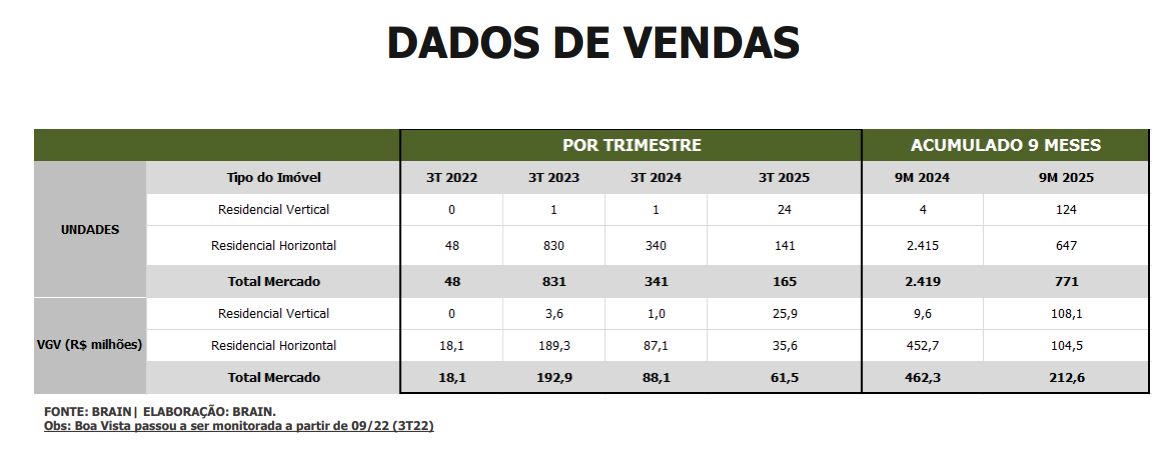 De acordo com o levantamento, o Valor Geral de Vendas (VGV) dos empreendimentos verticais residenciais aumentou mais de 1.000% em relação ao mesmo período de 2024, saltando de R$ 9,6 milhões para R$ 108,1 milhões entre janeiro e setembro deste ano. Já o VGV dos empreendimentos horizontais (loteamentos abertos, fechados e casas em condomínio) caiu 77%, passando de R$ 452,7 milhões em 2024 para R$ 104,5 milhões em 2025.