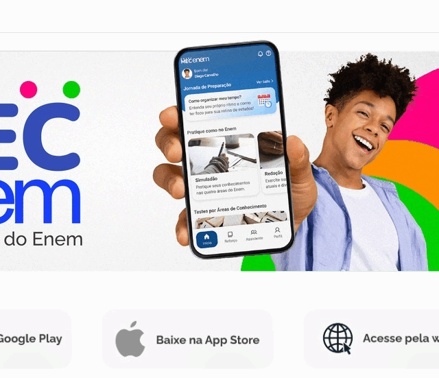 Lançado pelo Ministério da Educação (MEC) , o aplicativo contém simulados, correção automatizada de redação, materiais de apoio para revisão dos conteúdos, além de uma assistente virtual feita com Inteligência Artificial para dar suporte e tirar dúvidas dos estudantes.