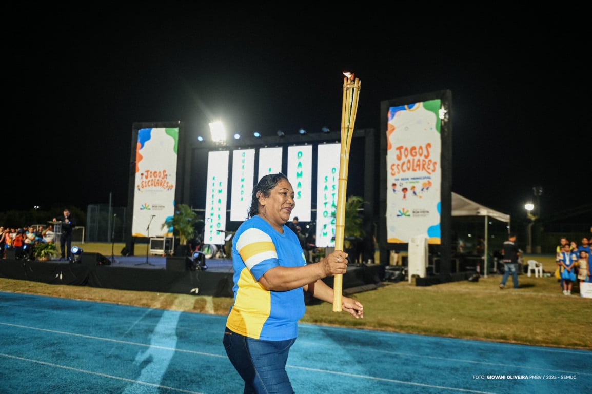 O revezamento da tocha olímpica, teve como protagonistas a aluna Maysa Victória, de 8 anos, cadeirante, da Escola Municipal Palmira de Castro Machado, e a estudante da EJA, Diana Souza, de 50 anos, representando diferentes gerações e histórias de superação.
