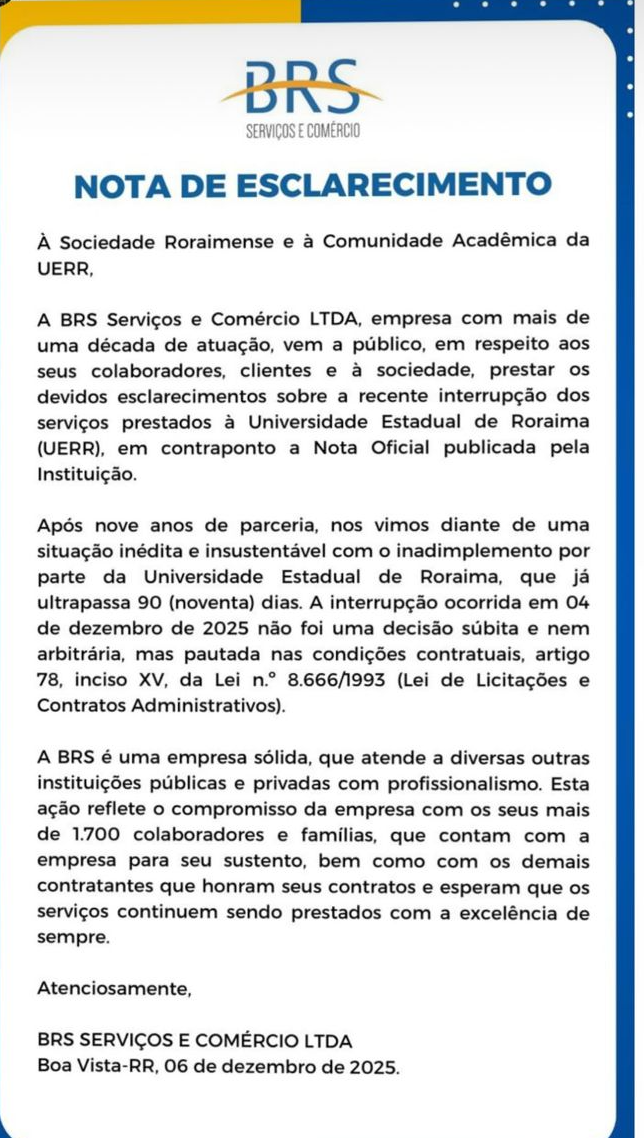 Em resposta, a empresa terceirizada divulgou nota de esclarecimento no último sábado (6) atribuindo a suspensão ao não pagamento por parte da UERR.