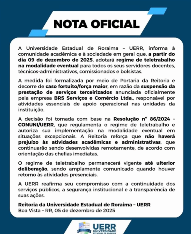 A Universidade Estadual de Roraima (UERR) anunciou que adotará o regime de teletrabalho em modalidade eventual para todos os servidores a partir desta terça-feira (9). A medida, segundo a instituição, foi formalizada por portaria e motivada pelo que classifica como caso fortuito ou força maior diante da suspensão dos serviços terceirizados que dão suporte às atividades operacionais.