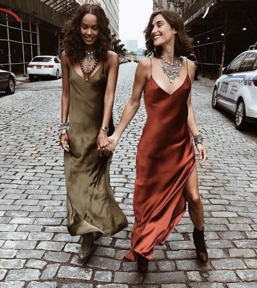 O slip dress aparece como opção elegante e minimalista. Em tons como branco ou bege, a peça pode ser combinada com sandálias delicadas e acessórios metálicos dourados ou prateados, criando um look fresco e moderno, ideal para noites quentes.