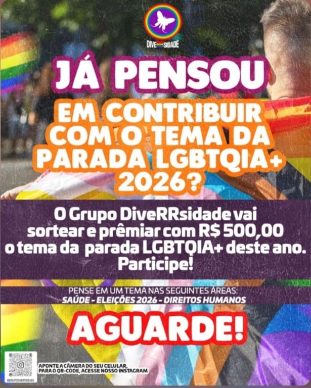 🌟🎉Segura esse babado! Pela primeira vez, o tema da Parada LGBTQIA+ de Roraima vai ser escolhido pelo público — e o melhor: o tema vencedor leva R$ 500,00. É criatividade, representatividade e muito close certo! 🌈🔥
