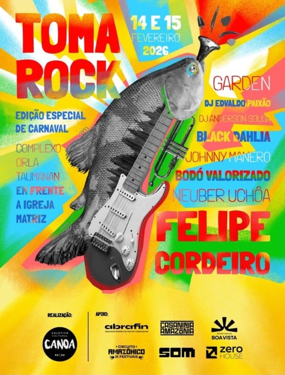 🐟🎸Foi aqui que chamaram? Nos dias 14 e 15 de fevereiro acontece o Festival TomaRRock, com entrada gratuita, em frente à Orla Taumanan, em uma edição especial de Carnaval. A programação promete reunir música, energia e público animado à beira-rio. 🎉✨