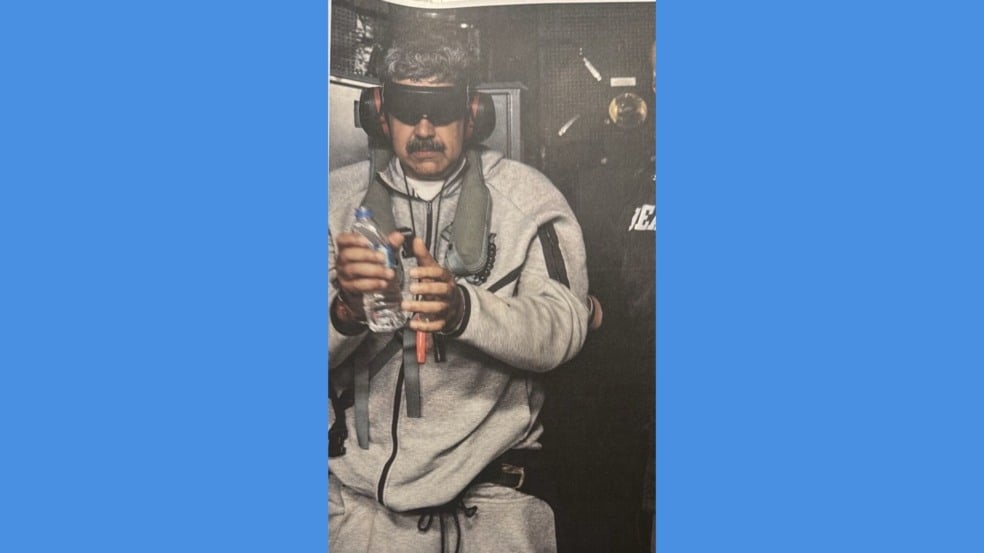 Na foto postada na rede social trumpista Truth Social, Maduro aparece em pé, com óculos escuros, fones de ouvido e uma garrafa de água na mão, além de vestido de colete e calça cinzas.