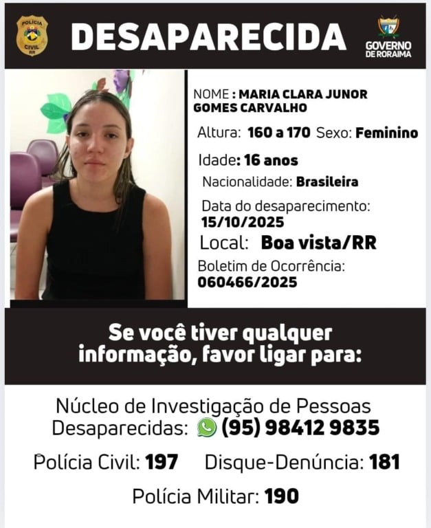A adolescente Maria Clara Junor Gomes Carvalho, de 16 anos, está desaparecida após ter sido entregue pelo Conselho Tutelar de Boa Vista a uma pessoa desconhecida, segundo denúncia do pai, Jack Jean Gomes Carvalho. O caso ocorreu depois de uma ocorrência policial registrada na madrugada da última segunda-feira (13), envolvendo um desentendimento familiar.