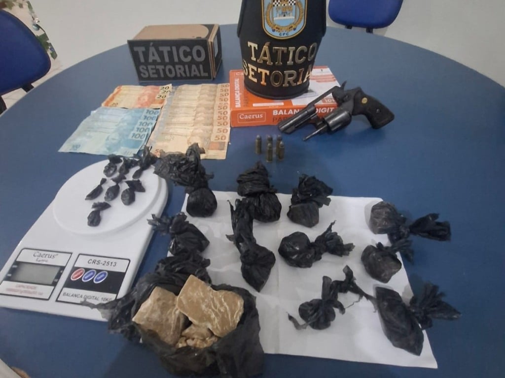 Durante a abordagem, os policiais encontraram dois invólucros de substância entorpecente, aparentando ser crack e cocaína nos bolsos de A.S.S. Já com a mulher, V.J.S., foram localizados sete invólucros de cocaína dentro da bolsa e um revólver calibre .38, carregado com cinco munições intactas.