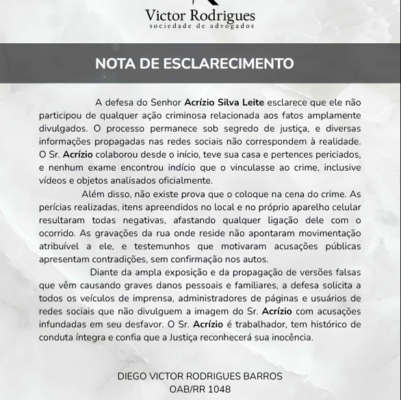 A defesa do policial militar Acrízio Silva Leite, acusado de envolvimento na morte da adolescente Débora dos Santos Bezerra, de 17 anos, divulgou nota pública em que nega qualquer participação dele no crime. O comunicado afirma ainda que não há provas que coloquem o PM na cena do crime ocorrido em maio de 2024, em Rorainópolis.