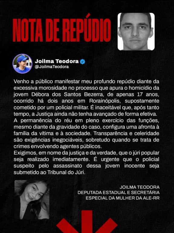 A deputada estadual Joilma Teodora (Podemos-RR) afirma ter recebido uma ameaça “velada” em um comentário feito na postagem em que ela cobrava agilidade no julgamento do policial militar, Acrízio Silva Leite, acusado de matar a adolescente, Débora dos Santos Bezerra, de 17 anos, em maio de 2024, em Rorainópolis.
