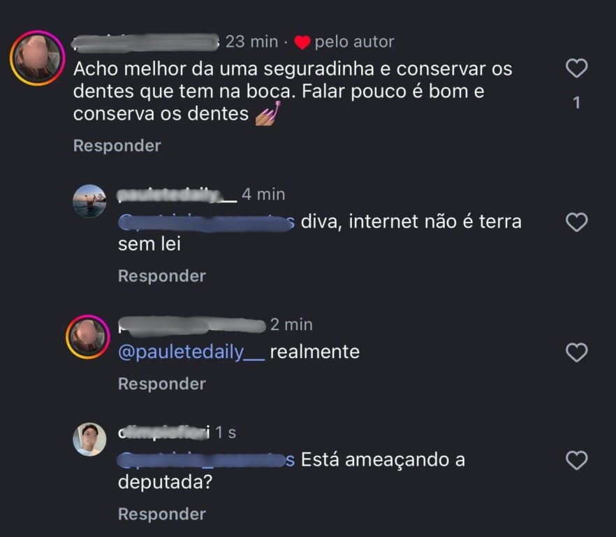 O comentário “Acho melhor da uma seguradinha e conserva os dentes que tem na boca. Falar pouco é bom e conserva os dentes” foi feito por uma mulher que segundo a deputada têm ligação profissional com o escritório que faz a defesa do policial.