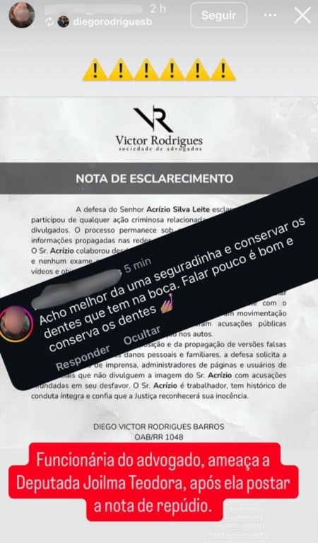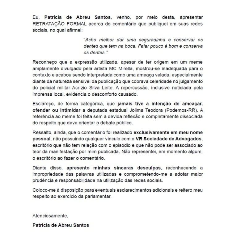 “Esclareço, de forma categórica, que jamais tive a intenção de ameaçar, ofender ou intimidar a deputada estadual Joilma Teodora (Podemos-RR). A referência ao meme foi feita sem a devida reflexão e completamente dissociada do respeito que deve orientar o debate público. Ressalto, ainda, que o comentário foi realizado exclusivamente em meu nome pessoal, não possuindo qualquer vínculo com o VR Sociedade de Advogados, escritório que não tem relação com o episódio e que não pode ser associado ao teor da manifestação por mim publicada”, um dos trechos da nota.
