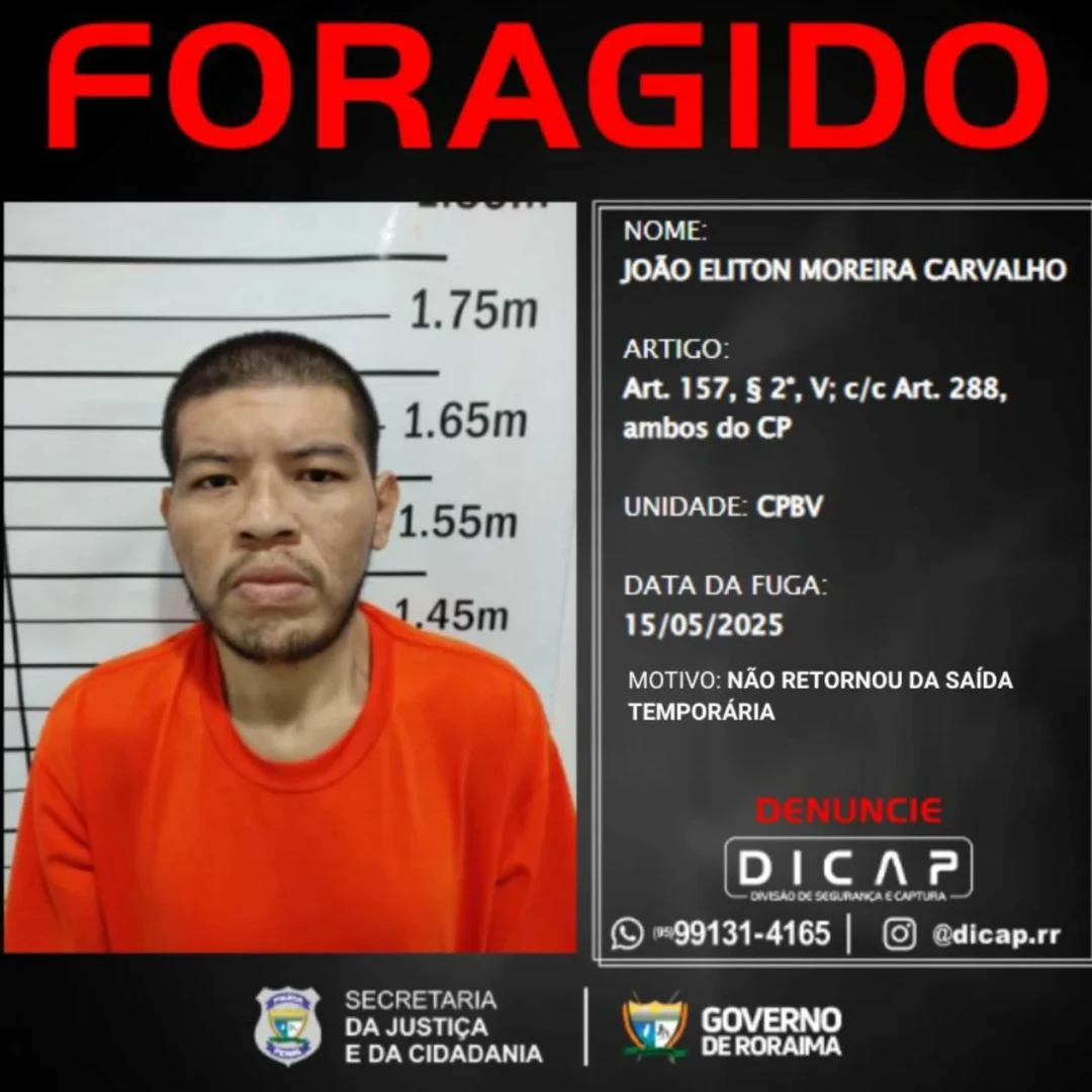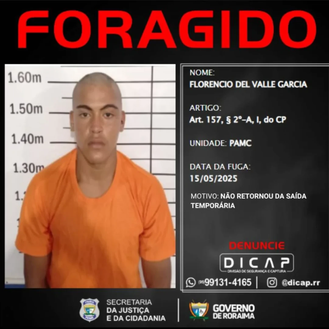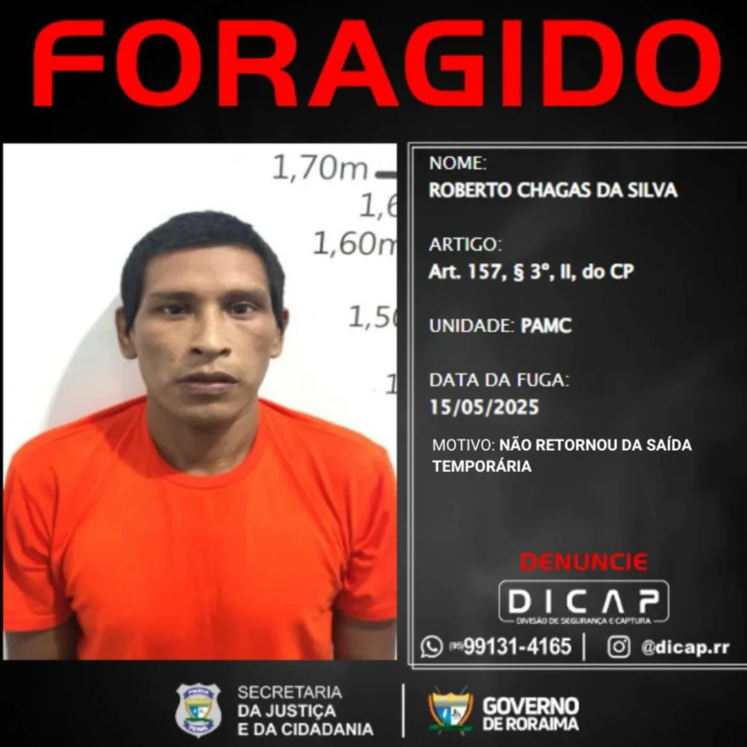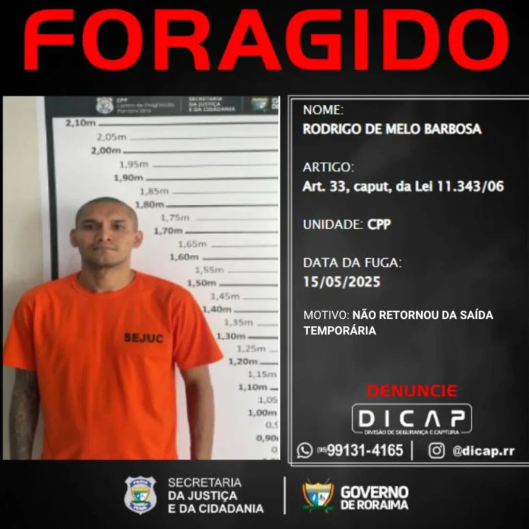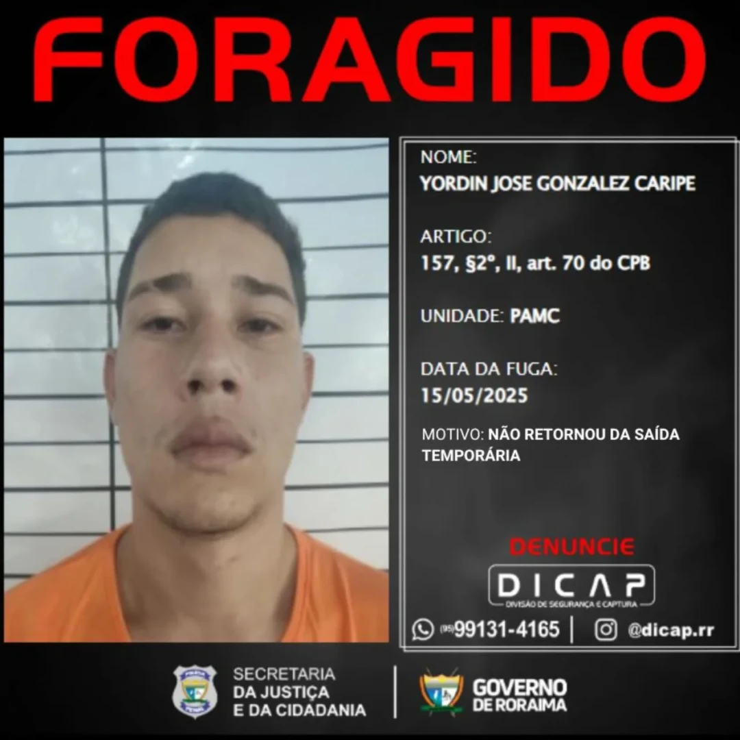 O perfil oficial da Divisão de Segurança e Captura da Polícia Penal de Roraima (DICAP) publicou nesta segunda-feira, 19 de maio, a lista dos foragidos que não cumpriram o prazo de retorno após serem beneficiados pela saída temporária.