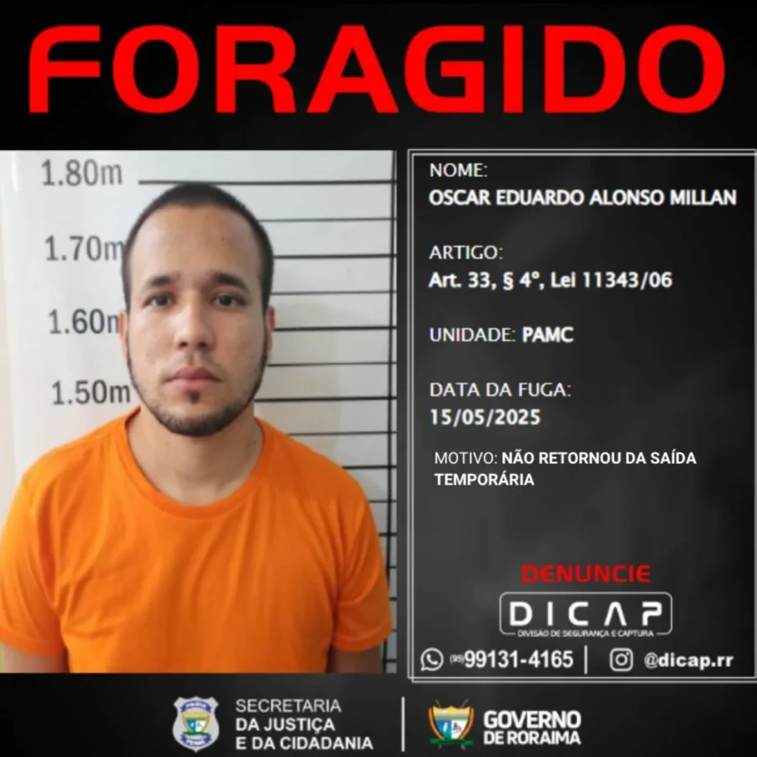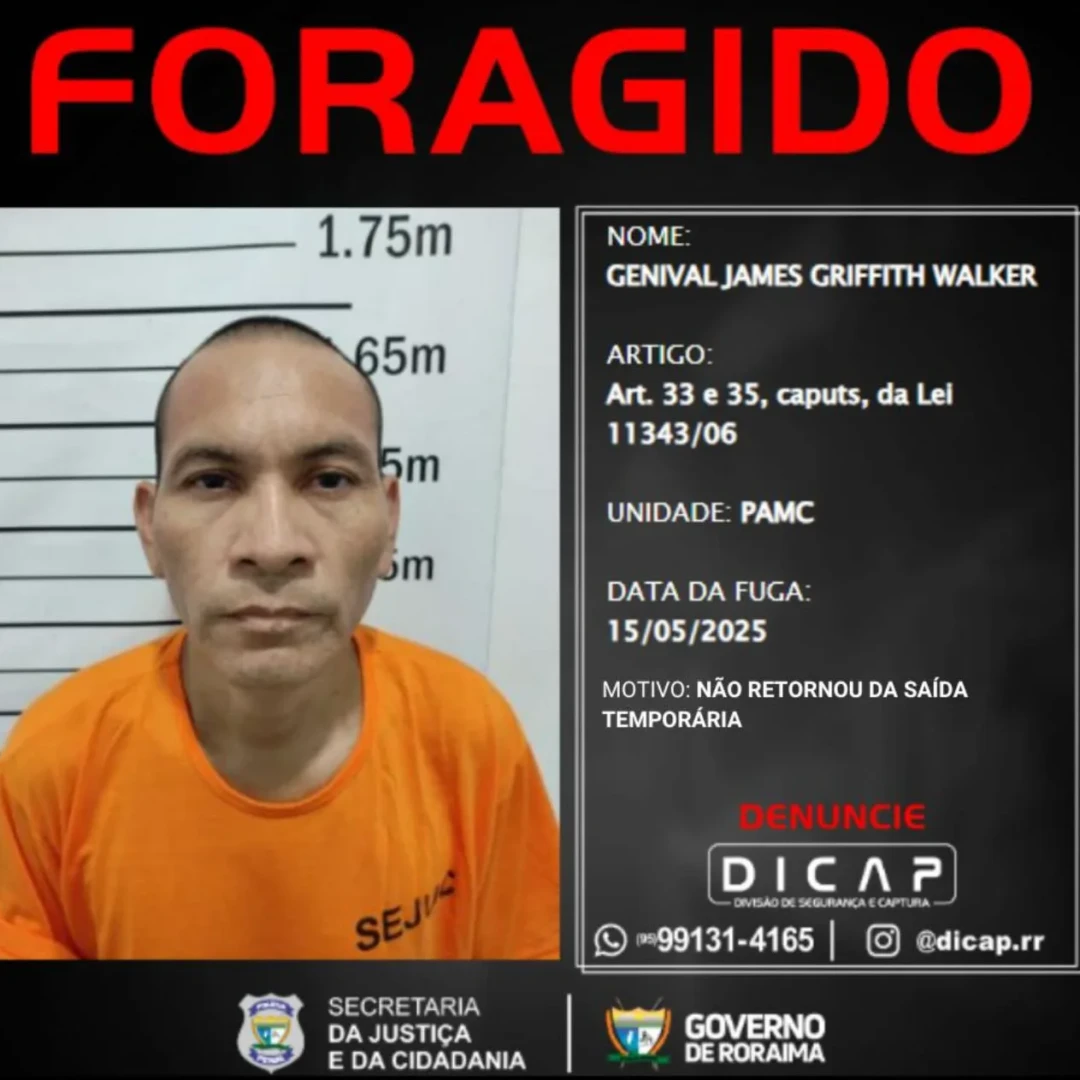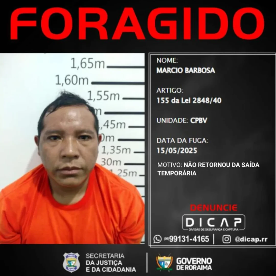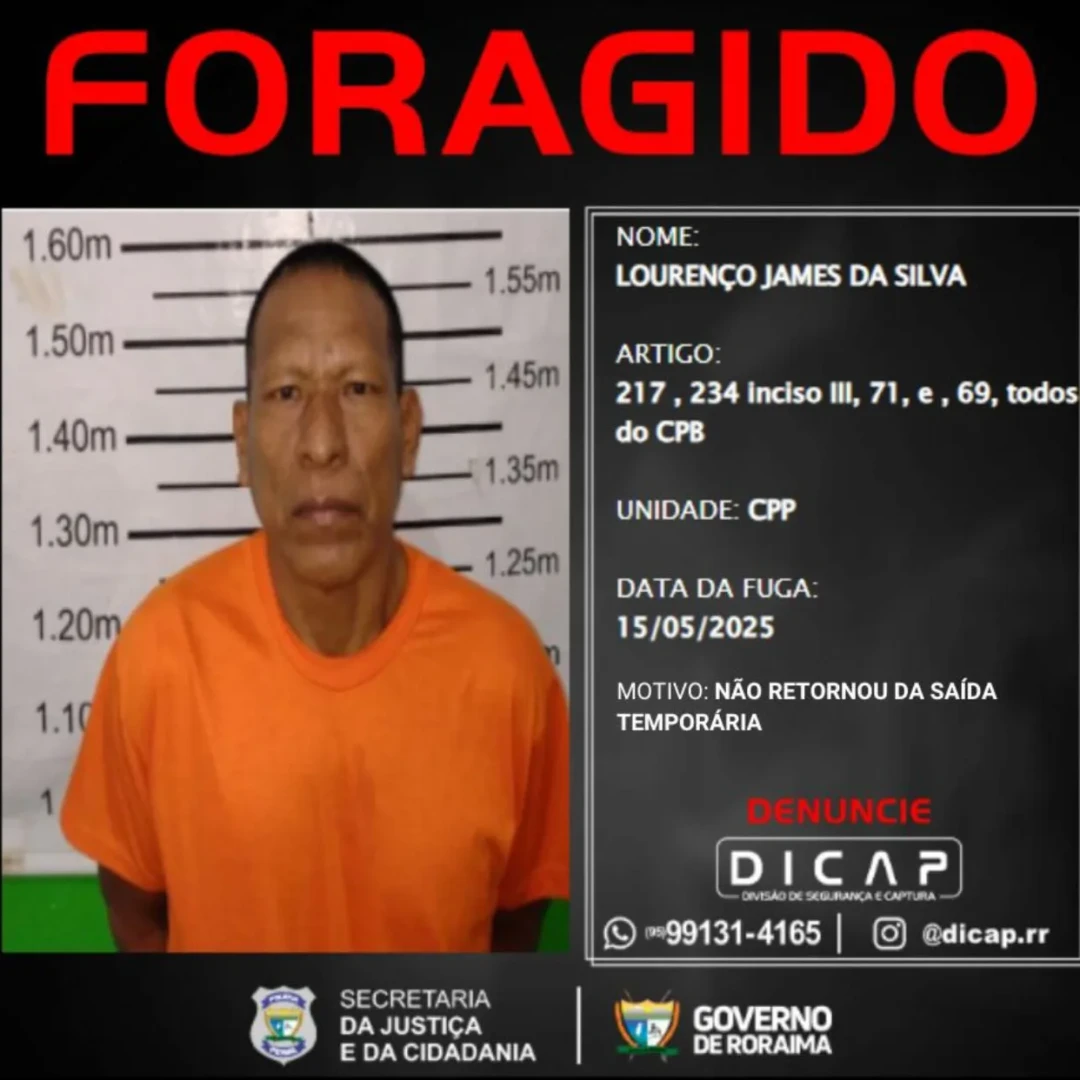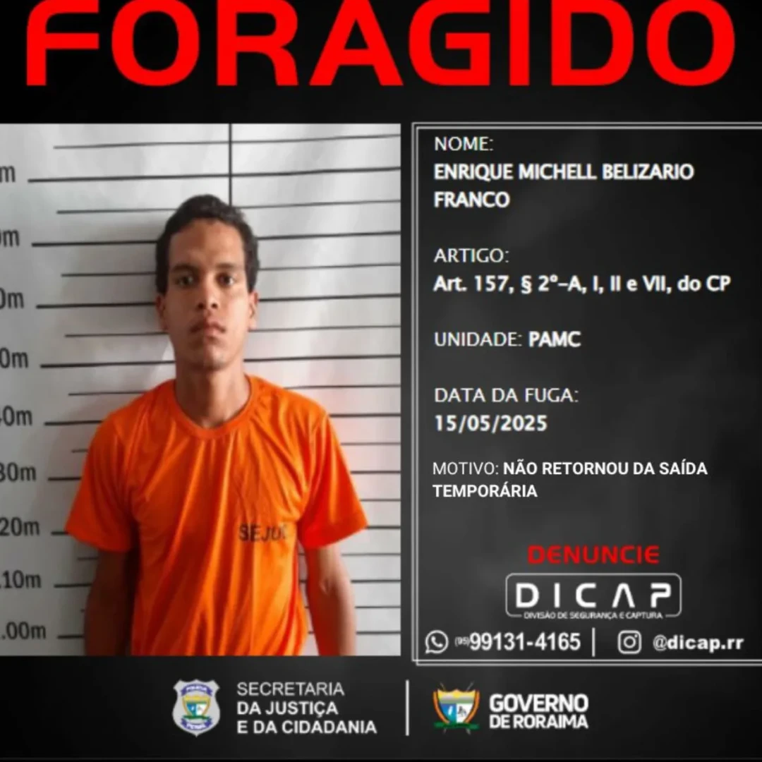 O perfil oficial da Divisão de Segurança e Captura da Polícia Penal de Roraima (DICAP) publicou nesta segunda-feira, 19 de maio, a lista dos foragidos que não cumpriram o prazo de retorno após serem beneficiados pela saída temporária.