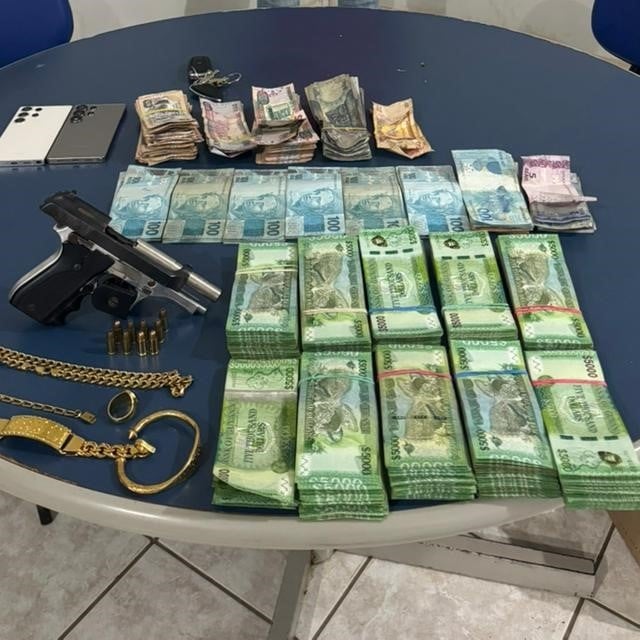 Na busca dentro do veículo, os policiais encontraram uma mochila contendo grande quantia em dinheiro estrangeiro, somando GY$ 4.641.540 dólares guianenses (equivalente a 1 milhão de reais), além de R$ 7.019 em espécie. Também foram apreendidos dois celulares, duas pulseiras, dois anéis, um bracelete e um cordão.