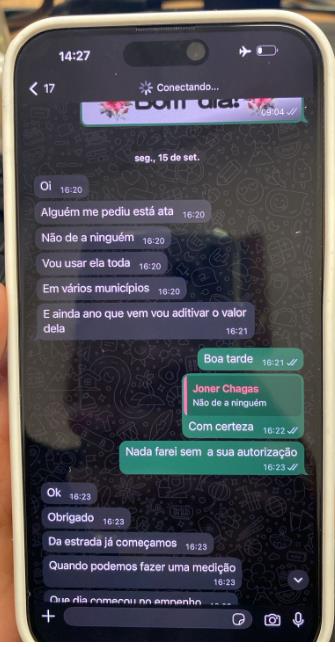 Nesse mesmo dia, o ex-prefeito orienta a empresária a não compartilhar uma ata de registro de preços, para que ele replique o documento em vários outros municípios. Joner Chagas ainda diz que, em 2026, vai aditivar o valor da ata. Mariângela responde: “nada farei sem a sua autorização”.