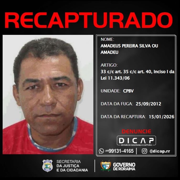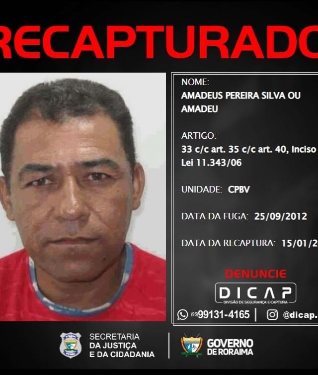 Após 12 anos foragido da justiça, Amadeus Pereira Silva foi localizado e preso pela Divisão de Inteligência e Captura (Dicap) nesta semana. O foragido foi preso pelos policiais penais enquanto estava internado no Hospital Geral de Roraima (HGR), em Boa Vista.