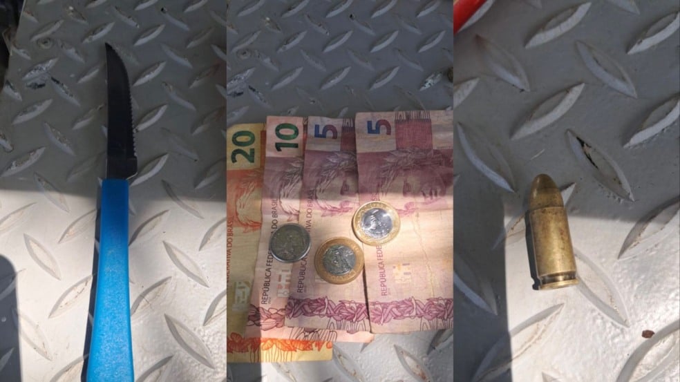 Durante a revista pessoal, os policiais encontraram com o suspeito uma munição de arma de fogo calibre 9 milímetros, sem procedência comprovada, além de uma quantia em dinheiro em espécie, em notas fracionadas, cujo valor não foi informado.