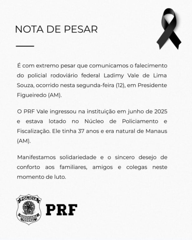 Em nota de pesar, divulgada pelas redes sociais, a Polícia Rodoviária Federal lamentou a morte de Ladimy Vale de Lima Souza e manifestou solidariedade aos familiares, amigos e colegas de trabalho.