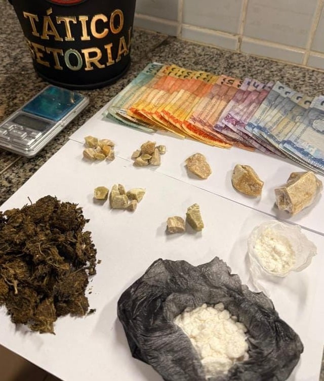 Durante a revista pessoal, foram encontradas com os suspeitos porções de cocaína, pasta base e skank. Além de R$514 em notas trocadas e uma balança de precisão.