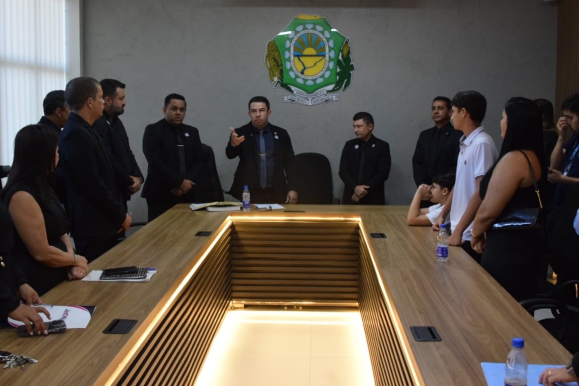 Durante o evento restrito no plenarinho, que contou com vereadores e familiares de Aguiar, o novo parlamentar assinou o termo de posse e prometeu cumprir as constituições e legislações vigentes.