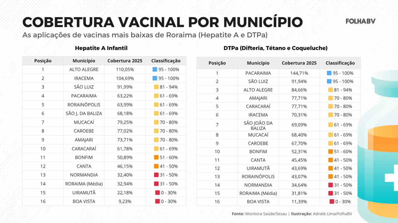 Em 2025, Boa Vista registra 9,35% na Hepatite A infantil, 29,76% na Febre Amarela e 11,39% na DTPa. Todos inferiores às médias estaduais e ao desempenho de municípios como Alto Alegre, Bonfim, Iracema, Caracarai, Pacaraima e Normandia.
