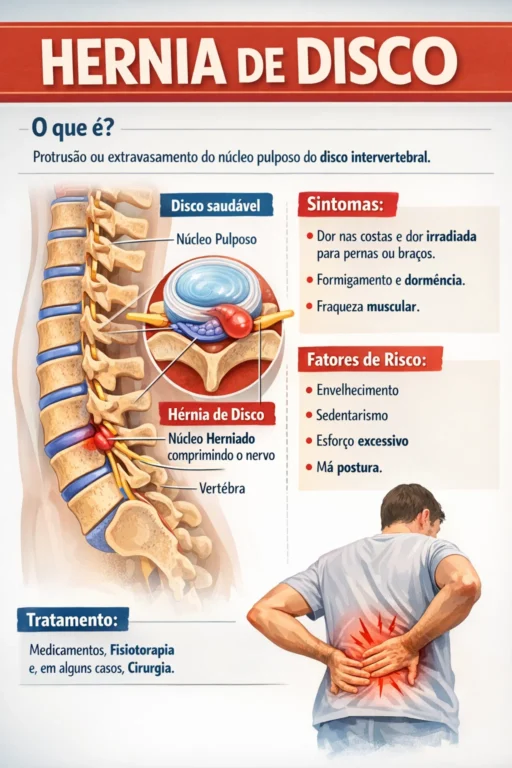 A hérnia de disco ocorre quando há desgaste ou ruptura da parte externa do disco, permitindo que o núcleo interno se desloque. Esse deslocamento pode comprimir nervos próximos, provocando dor e outros sintomas neurológicos. As regiões mais afetadas costumam ser a coluna lombar (parte inferior das costas) e a coluna cervical (pescoço).