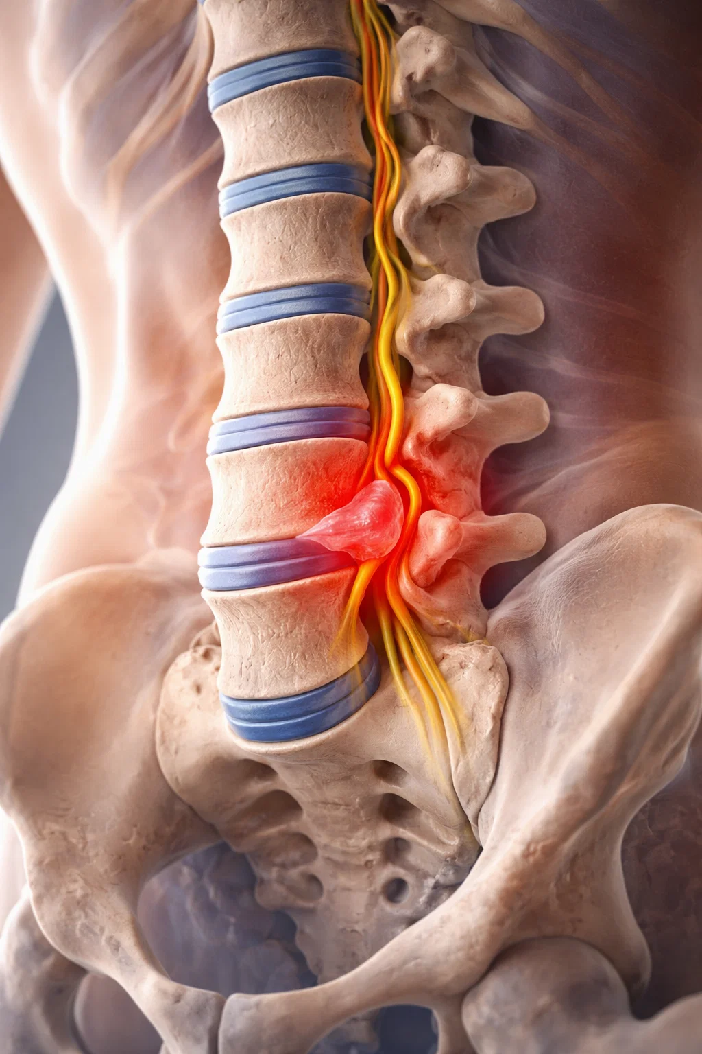 A hérnia de disco ocorre quando há desgaste ou ruptura da parte externa do disco, permitindo que o núcleo interno se desloque. Esse deslocamento pode comprimir nervos próximos, provocando dor e outros sintomas neurológicos. As regiões mais afetadas costumam ser a coluna lombar (parte inferior das costas) e a coluna cervical (pescoço).